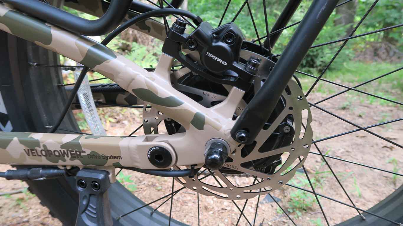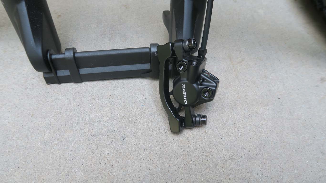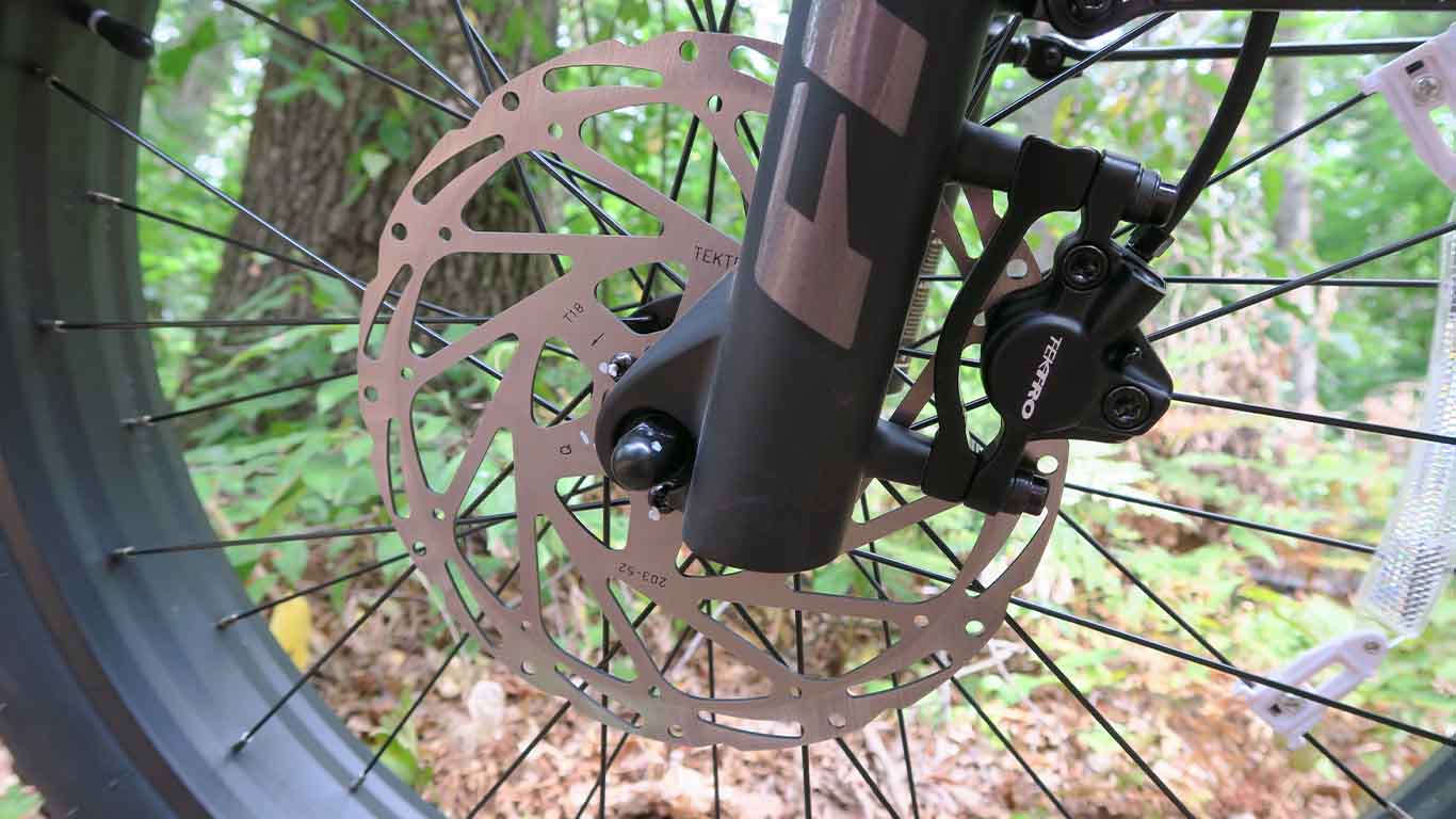 203mm Tektro hydraulic disc up front, 180mm in the back. That’s big-bike braking power. Even bombing down a steep trail loaded with gear, this thing stops like a champ. No fade, no squeal, just solid confidence.